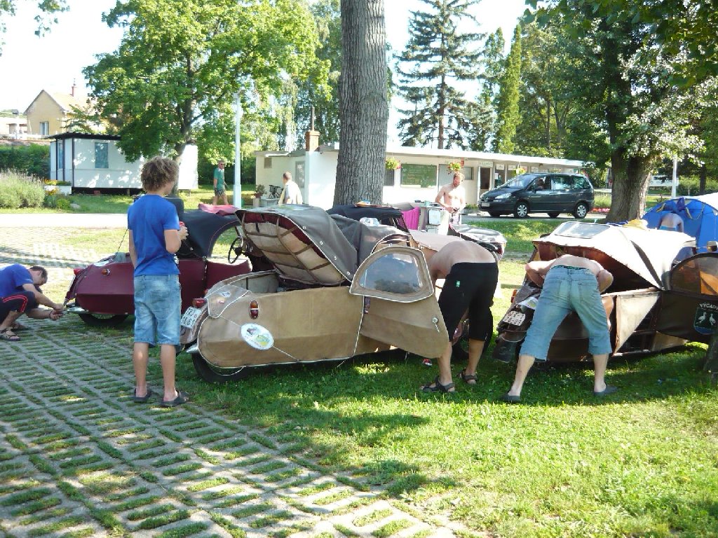 8.8. ráno kluci vyhlásili servisní dopoledne. Rosťa na protest lehl na karimatku, vzal noviny a s konstatováním: "Každý dělá to co umí" se pustil do luštění křížovek. Robert zgenerálkoval zadní nápravu (dá se to tak vůbec říct?), Milda ladil plovák a vejfuky, já jsem řetěz povolil a Osud utáhl. No a pak jsme vyrazili okolo Balatonu do Balatonfuredu. Super výlet, nádhernej přístav, a pak ta jízda kolem pláží - načisto Chorvatsko. Opravdu krása. Tam to žilo. Cestou zpátky jsme navštívili vojenské muzeum. Po návratu někteří neměli oprav dost a tak třeba Robert vytáhl oba svisláky a zgenerálkoval i přední nápravu:o) Najeli jsme rovných 50km + večer jsme nachodili 10 km pěšky po Balatonczepezdu a hledali hospodu. Když jsme ji pak našli, zjistili jsme že jsme se jí asi tak 2x úspěšně vyhnuli :o))) Vyzkoušeli jsme 2 hospody a zmoženi maďarskýma škopkama ulehli k letnímu spánku.