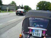 9.8. ráno jsme posnídali a přežili jsme útok maďarských špačků, kteří si strom nad náma vybrali jako tréninkovou bombardovací základnu. V klídečku jsme sbalili, rozloučili se, naposled se vykoupali a vyrazili změrem Tapolca-Pápa-Kapuvár. Natankovali jsme (benál v Maďarsku cca 42kč v přepočtu). Než jsme překročili do Osterreichu, staly se nám 2 příhody. Za prvé: jedeme, proti tři auta, mávají (jako ostatně všichni celou cestu), akorát si nevšimli, že to první bliká doleva a zastavuje. Ozvalo se ÚÚÚÚÚÚÚÚíííííííííííííí......a v zrcátku jen bílej kouř od gum a.... BUCHHH, tesně vedle Roberta, no dopadlo to pro nás dobře - ujeli jsme :o))).