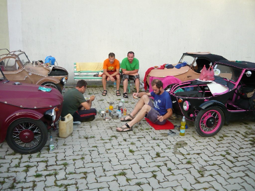 Ještě se musím vrátit k přípravám, protože ještě ve středu 6tého v půl deváté večer, kdy se u mě stavil Milda s tím, že to nemůže vyladit a když uviděl mýho fronťáka na zvedáku s rozebranou rozetou, začal se smát... Co dodat, pozdě, ale přece jsme to všichni naladili a ve čtvrtek 7.8. v 6 ráno dělali u Rostě v Hrotovicích první odjezdovou fotku.