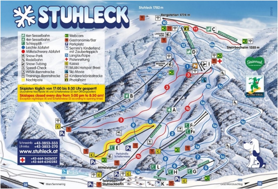Stuhleck - Spital am Semmering je svými 1782 m nejvyšší horou na východním okraji Alp a největší lyžařsou oblastí východního Rakouska a skutečným rájem pro lyžaře a milovníky sněhu. Středisko nabízí převýšení 1000 m. Na vrchol hory se můžete nechat vyvézt navazujícími komfortními – 4-sedačkovými a 6-sedačkovými lanovkami, které jsou částečně vybaveny stříškou proti nepřízni počasí, a potom si užívat celkem 26 km dlouhé sjezdy se zárukou sněhu. Autobus parkuje v 777 m v bezprostřední blízkosti sjezdovek. Vleky jezdí 8.30 - 16 h.